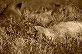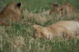 portrait of a lioness sleeping in the grass of the serengeti national park after eating too much