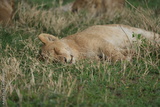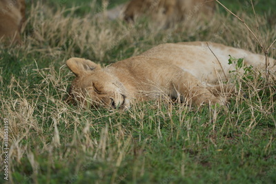 portrait of a lioness sleeping in the grass of the serengeti national park after eating too much