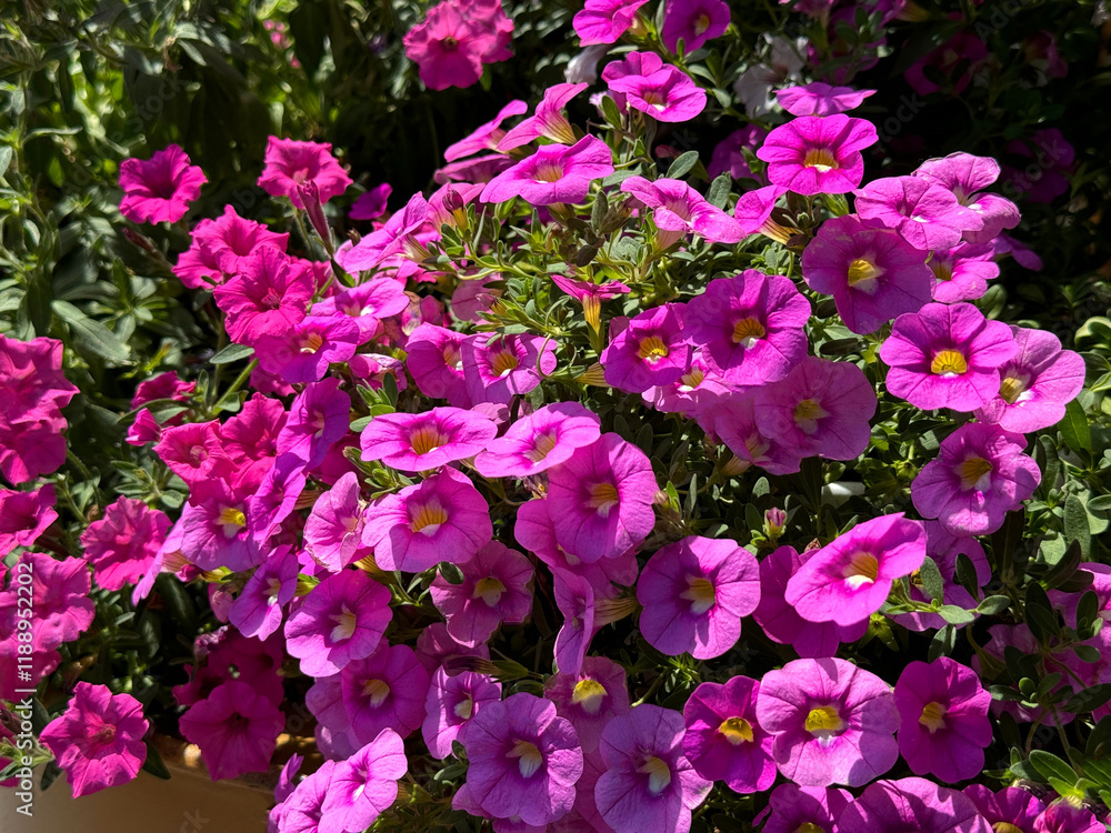 Calibrachoa parviflora pink flowers blossom million bells or mini petunias.