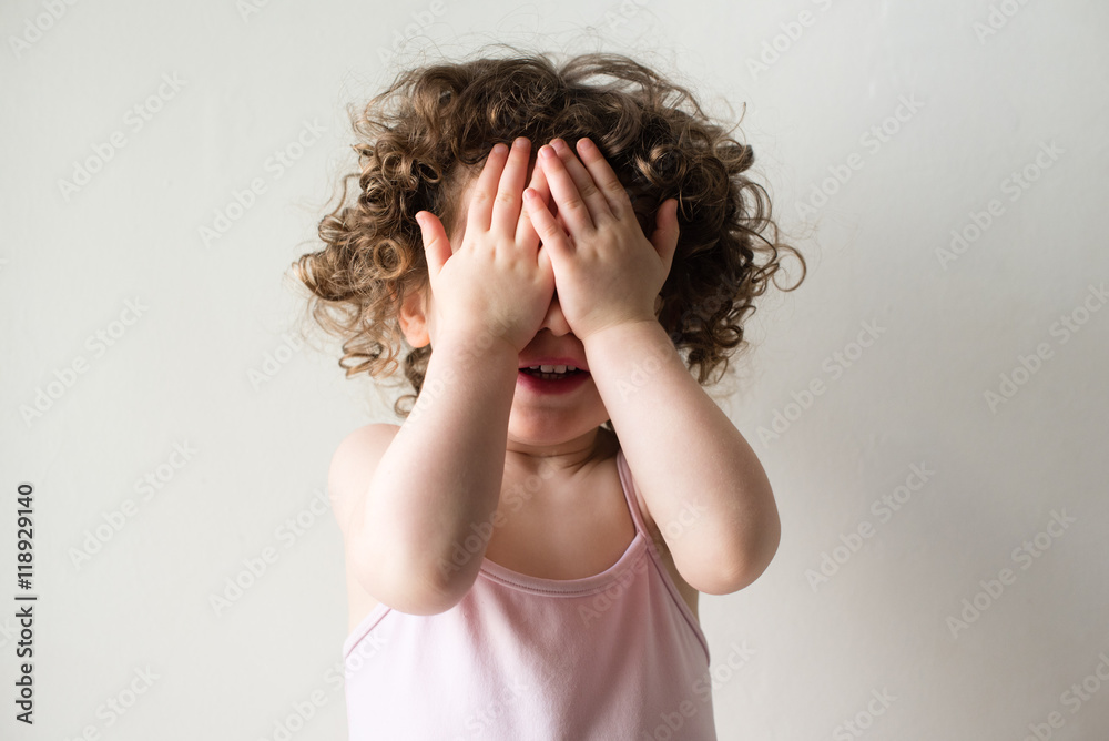 Toddler girl with curly hair with hands covering face playing peekaboo against neutral background