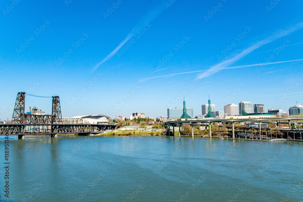 Steel Bridge and City Skyline Along Willamette River in Portland, Oregon