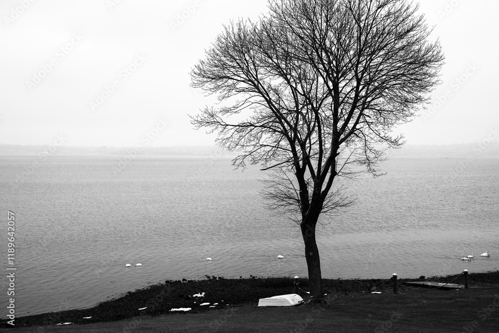Beach seascape with a bare tree and swans in the water in snow: a tranquil winter shore in New England of America in black and white colors