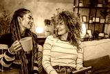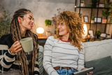 cheerful female friends sit on sofa and enjoy while use digital tablet