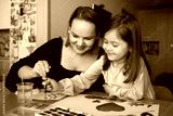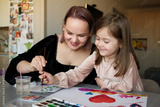 A mother and her daughter enjoy painting together in a cozy home environment. They bond through creativity, sharing smiles and joy while creating colorful artwork on paper with watercolor paints.