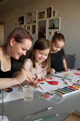 A cheerful family bonding while painting creative watercolor artworks. Two children and an adult actively engaged in art activities in a cozy home environment, sharing smiles, creativity, and teamwork
