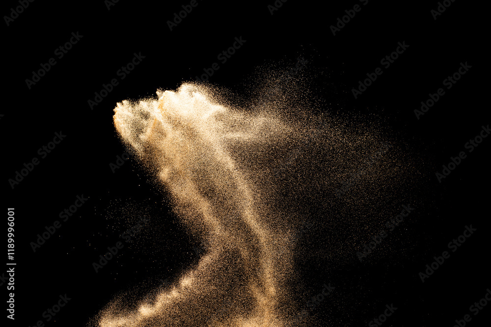 Sand flying explosion isolated on black background ,throwing freeze stop motion object design.