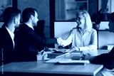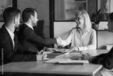 Business parts conclude partnership, finalizing formal meeting negotiations in boardroom with handshake gesture of trust, mutual respect and agreement. Mature and young shareholders greet each other