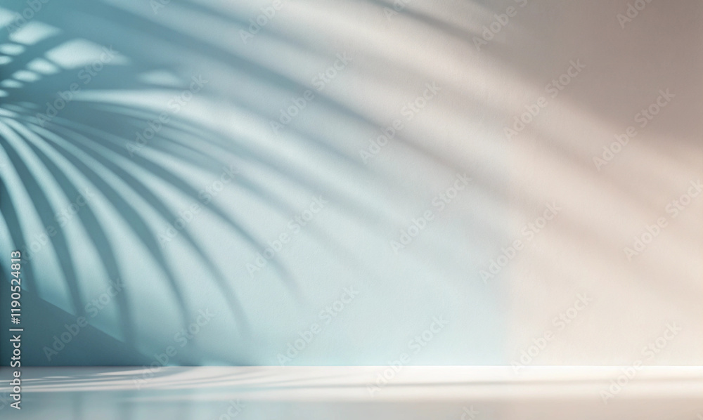 Minimalist simple background for design with beautiful light shadow from palm leaves on wall, gentle calm pastel muted shades of blue and beige with smooth color transition.