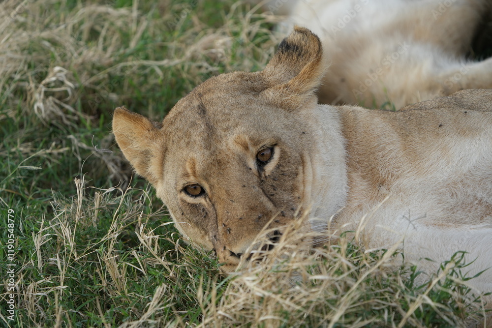 close up headshot of a female lion, lioness headshot, portrait, serengeti national park