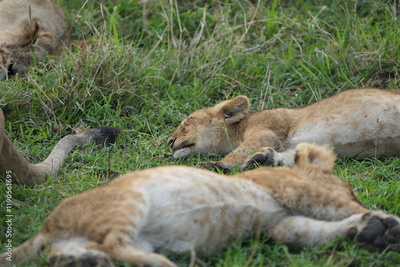 young lion cubs knock out in the grass sleeping after a big meal, serengeti national park tanzania