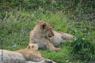 lion cub panthera leo laying in the grass of the serengeti national park