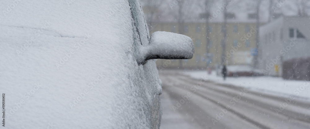 SNOWSTORM IN THE CITY - Vehicle and street are covered with a layer of snow