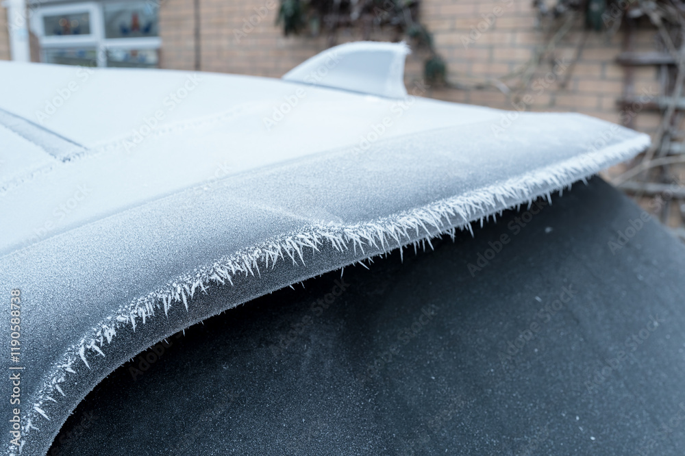 Heavy frost and ice crystals seen on the rear spoiler of a hybrid car seen after a severe ice storm in the UK. The car is parked on a private driveway just before defrosting.