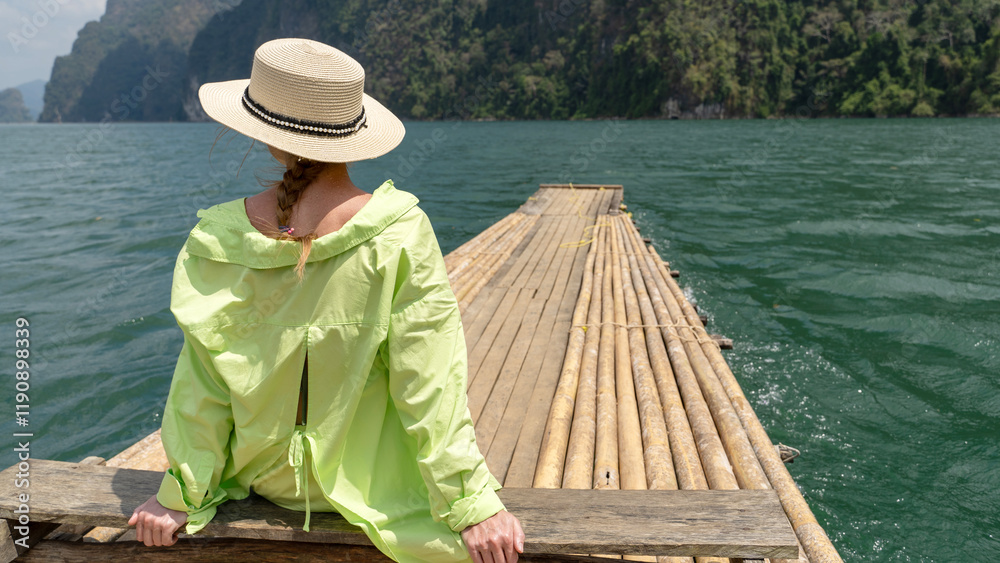 Woman on a bamboo raft floating on a lake or river