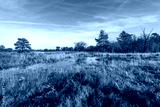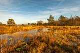 Protected nature reserve consisting of heather and yellowed grasses on a sunny day with a blue sky in the autumn season. It has rained for a long time so that puddles of water have formed everywhere.