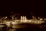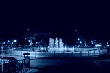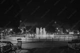 Nighttime view of a glowing green fountain surrounded by a paved area, benches, trees, and streetlights, with historic domed structures in the background.
