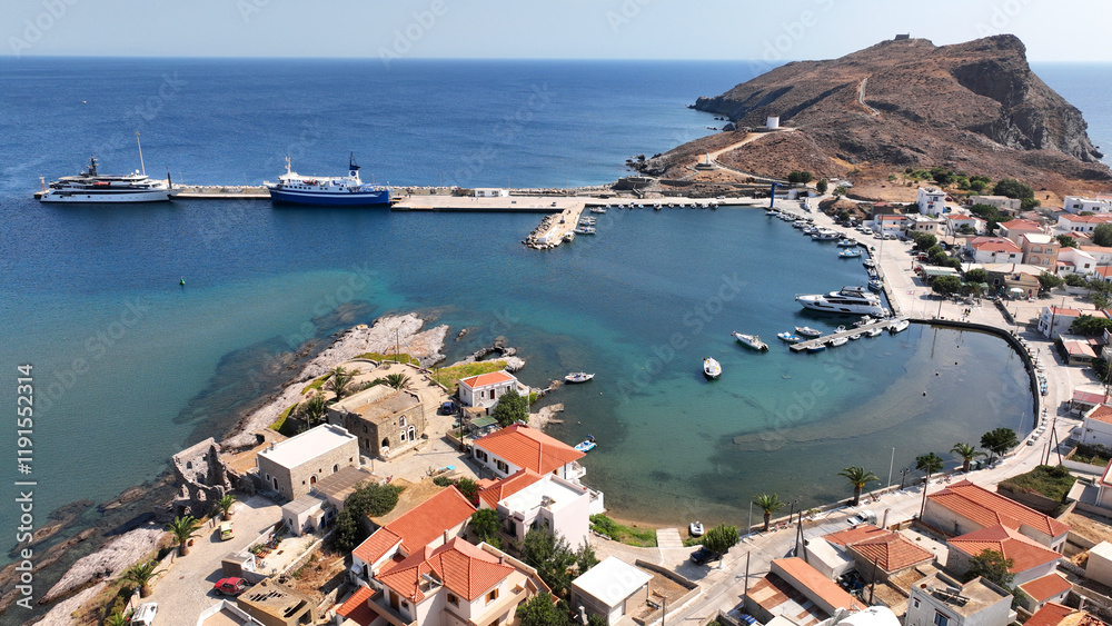 Aerial drone photo of picturesque main port of historic island of Psara, North Aegean sea, Greece
