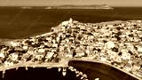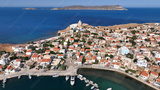Aerial drone photo of picturesque and historic main village of Psara island featuring landmark church of Saint Nikolas, North Aegean islands, Greece
