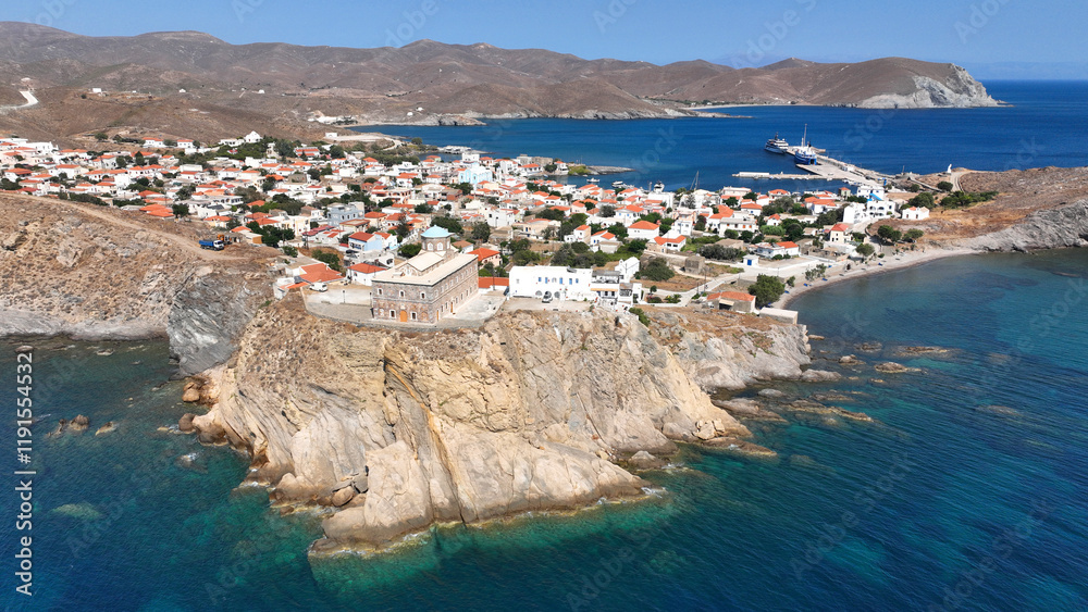 Aerial drone photo of picturesque and historic main village of Psara island featuring landmark church of Saint Nikolas, North Aegean islands, Greece