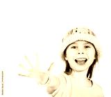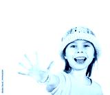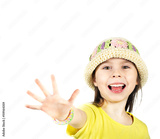Cute little girl happily shows an open hand