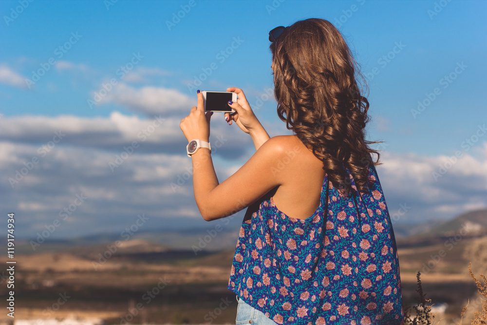 Pretty teen girl taking photo of nature by phone