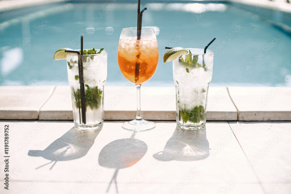 Cropped photo of a three cocktails near swimming pool