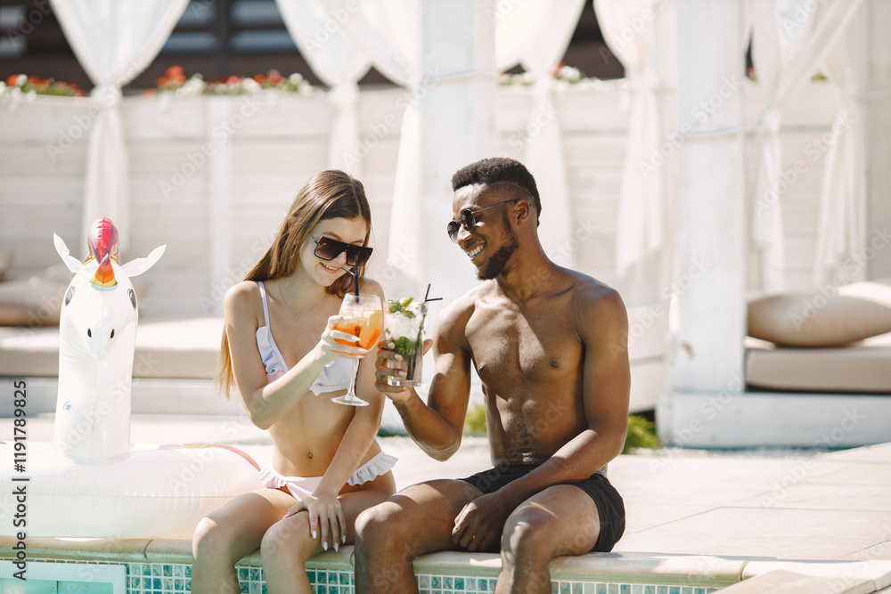 Caucasian girl and black boy sitting near the pool and drinking cocktails