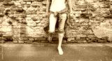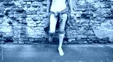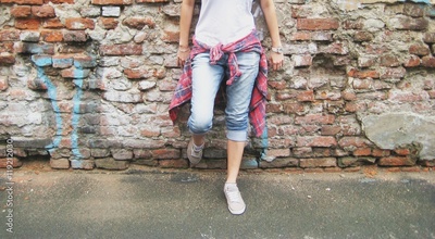 Cropped retro lifestyle portrait of stylish young person in casual clothes: white t-shirt, plaid shirt, blue jeans and gray sneakers standing against urban brick wall background.