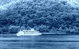 Excursion Ship on a lake in the mountains with a green hill in the background