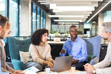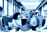 Startup business team on meeting in modern bright office interior and working on laptop