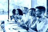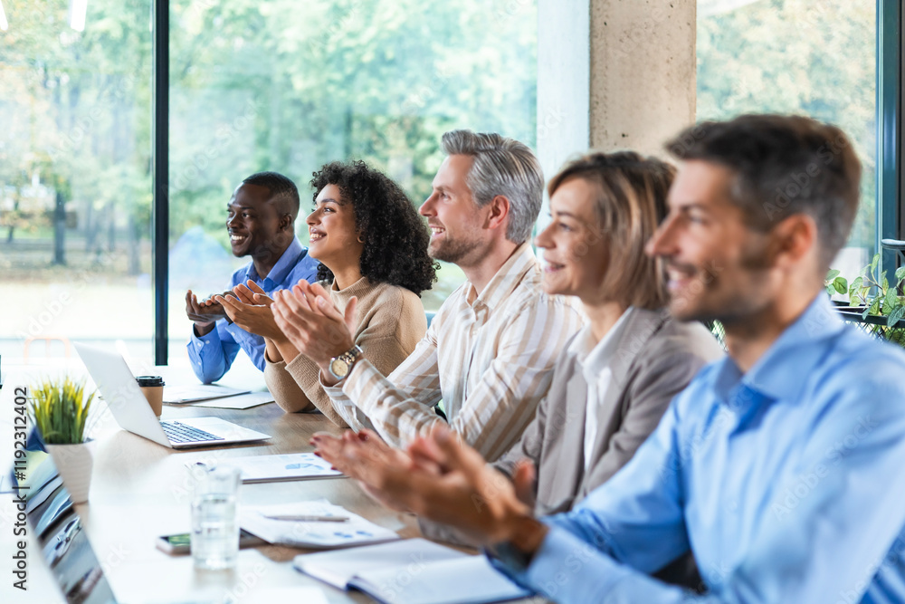Image of colleagues clapping hands at seminar, listening speaker. Business education