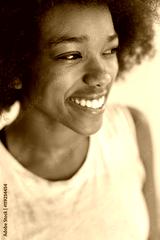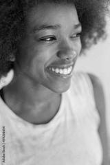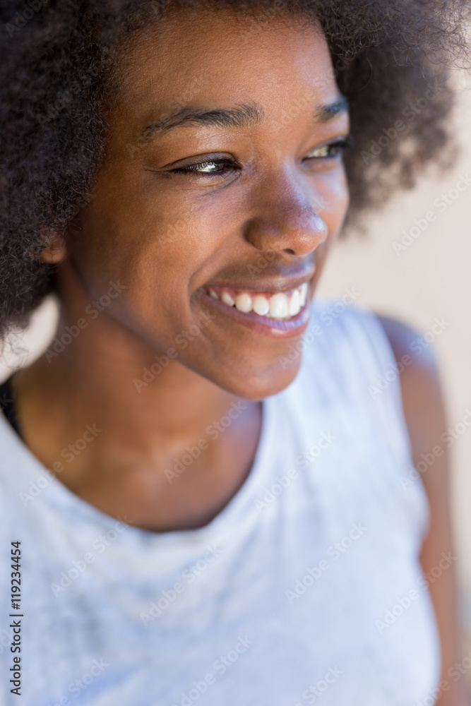 lose up portrait of a beautiful black woman smiling and looking