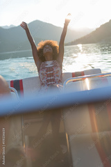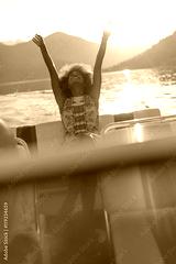 sexy afro girl rides on a speed boat with hands lifted up