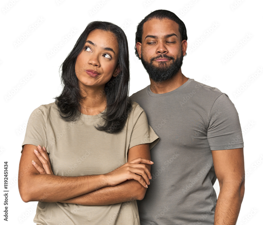 Young Latino couple in studio dreaming of achieving goals and purposes