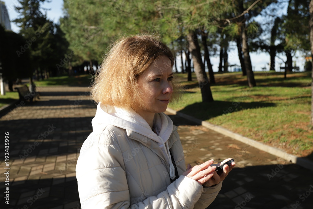 Woman using smartphone outdoors in city, using a cellphone with wifi to browse apps, exploring technology for social and digital interaction.