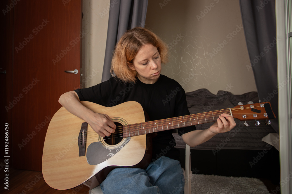 Woman playing acoustic guitar at home, person studying music with a wooden instrument, indoor lifestyle focused on learning and skill-building.
