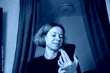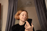 Excited Woman Reacting to Phone Screen, thrilled by winning moment, using technology indoors for content and satisfaction.