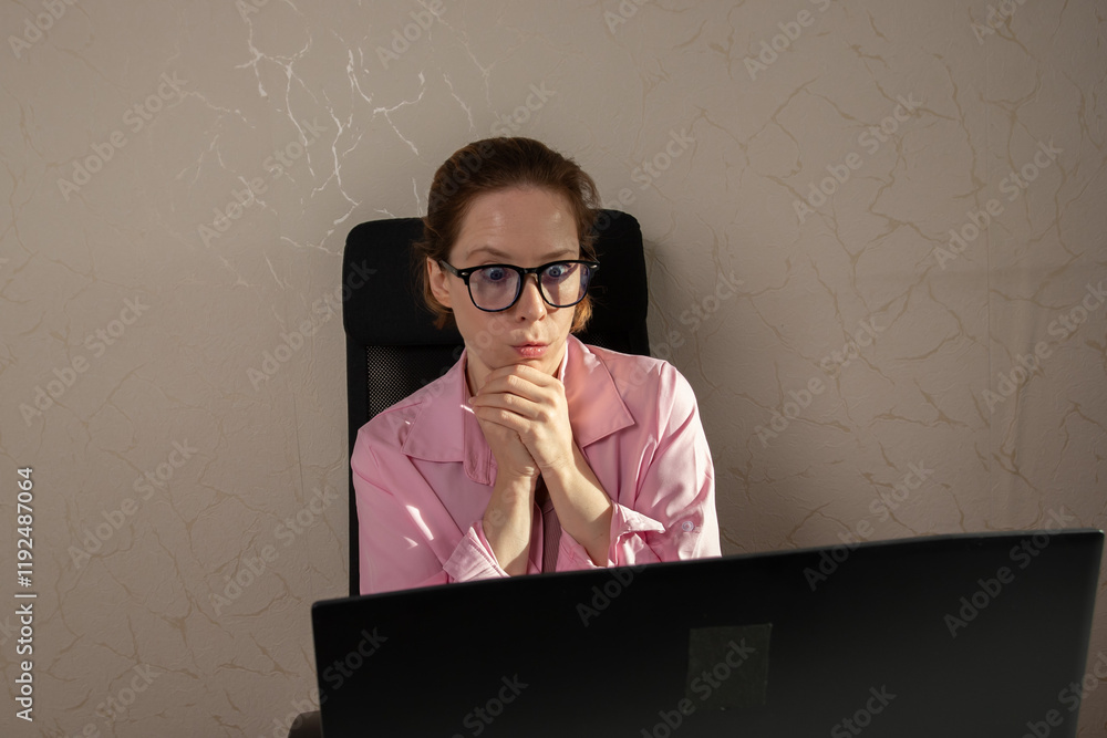 surprised woman in office at laptop, adult female reaction, professional digital workspace