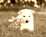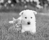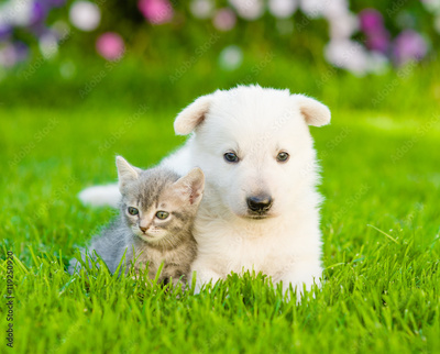 White Swiss Shepherd`s puppy and kitten lying together on green grass