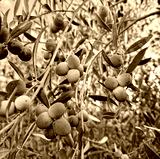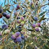 Ripe olive berries on olive tree. Blurred nature at the background.