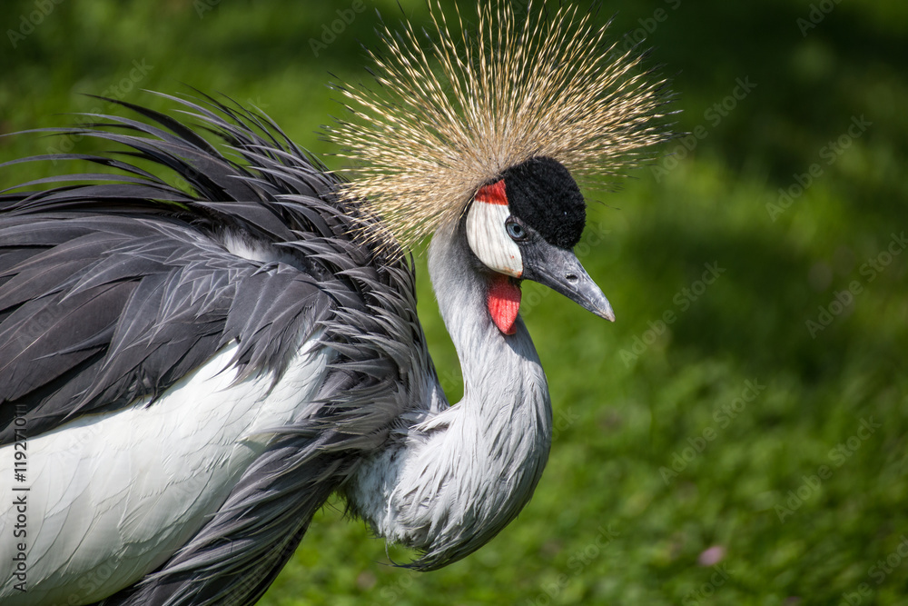 Crowned crane portrait with green background