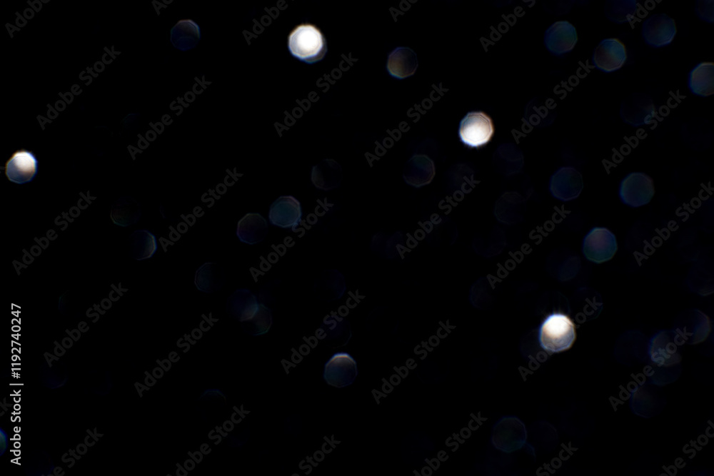 Blurred abstract light bokeh on dark background with soft circular glow and sparkling dots.