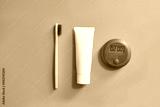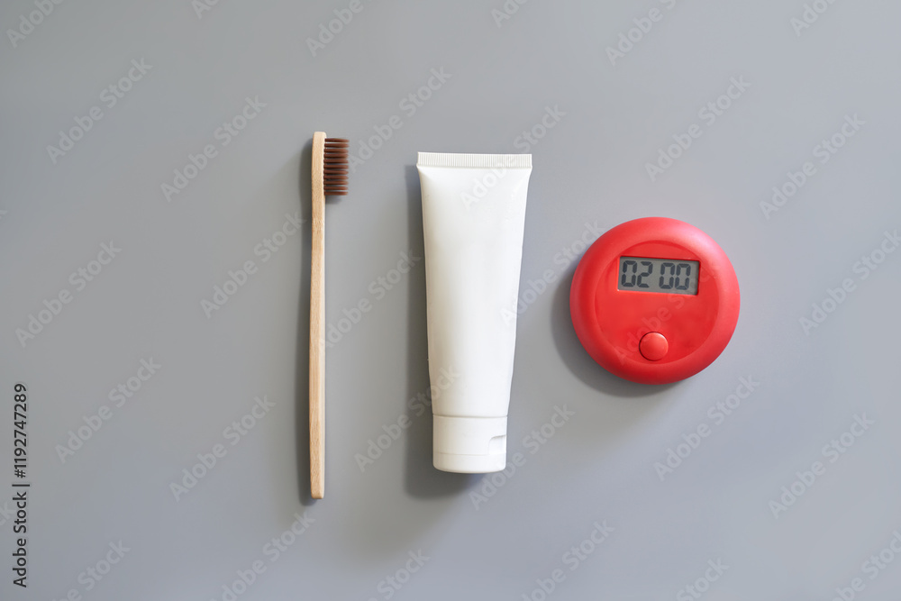 Eco friendly bamboo toothbrush with toothpaste tube and red digital timer on gray background.