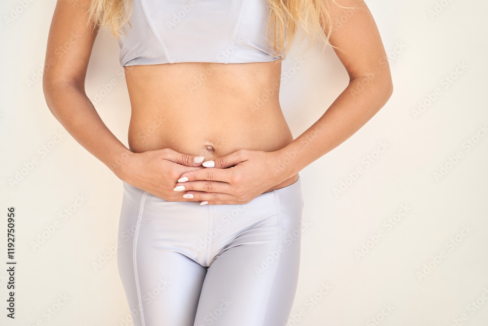 Caucasian young female in athletic wear holding stomach in discomfort against neutral background.
