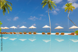 Amazing landscape, swimming pool blue sky with clouds. Tropical resort hotel in Maldives. Fantastic relaxing peaceful vibes, chairs, bed under umbrellas and palm tree leaves. Luxury vacation tourism