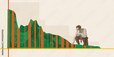 Man observing declining economic chart, symbolizing financial crisis and market downfall. Conceptual creative design. Concept of inflation, finances, economic crisis, business challenges