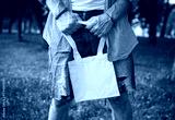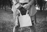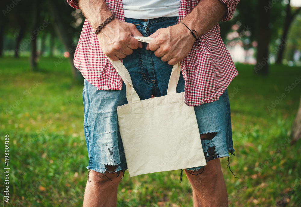 Man holds an eco-friendly small shopping handbag, standing outdoors among grass and trees. The image features empty copy space for mockup and business use
