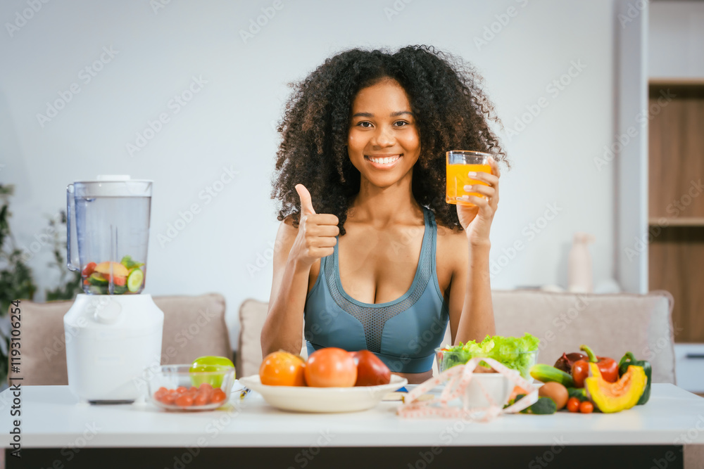 An African American woman in sportswear sits on a sofa near the dining table, preparing a healthy salad with vegetables fruits, drinking juice after exercise for weight control and low-fat nutrition