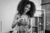 An African American woman in sportswear sits on a sofa near the dining table, preparing a healthy salad with vegetables fruits, drinking juice after exercise for weight control and low-fat nutrition