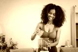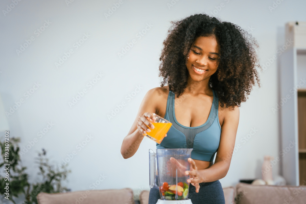 An African American woman in sportswear sits on a sofa near the dining table, preparing a healthy salad with vegetables fruits, drinking juice after exercise for weight control and low-fat nutrition